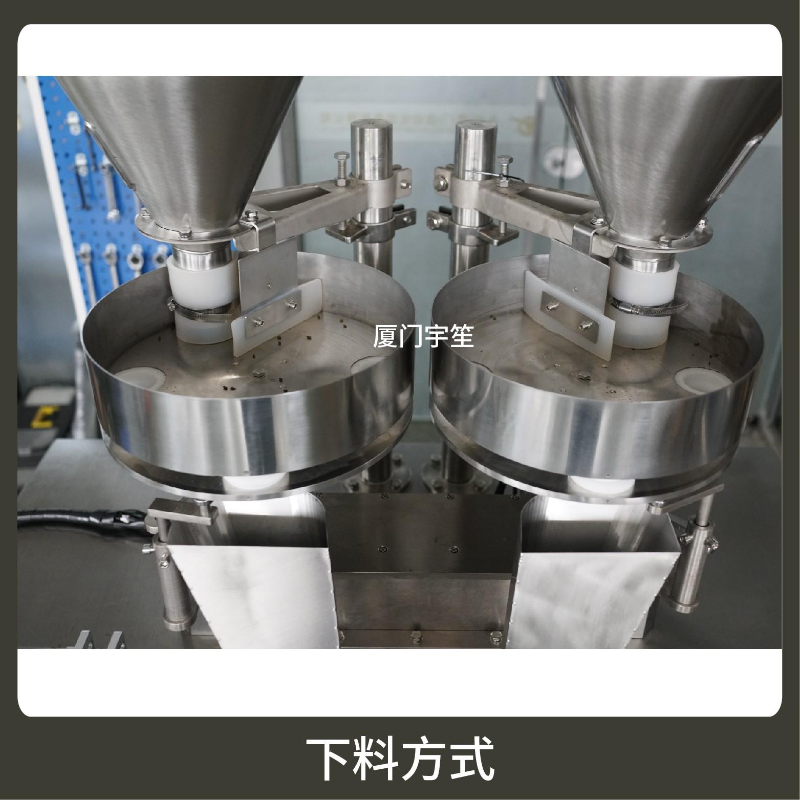 2、成品雙出,速度快,包裝流程全自動,無需人工操作??筛鶕?jù)充填物料的性質選配不同的下料結構。