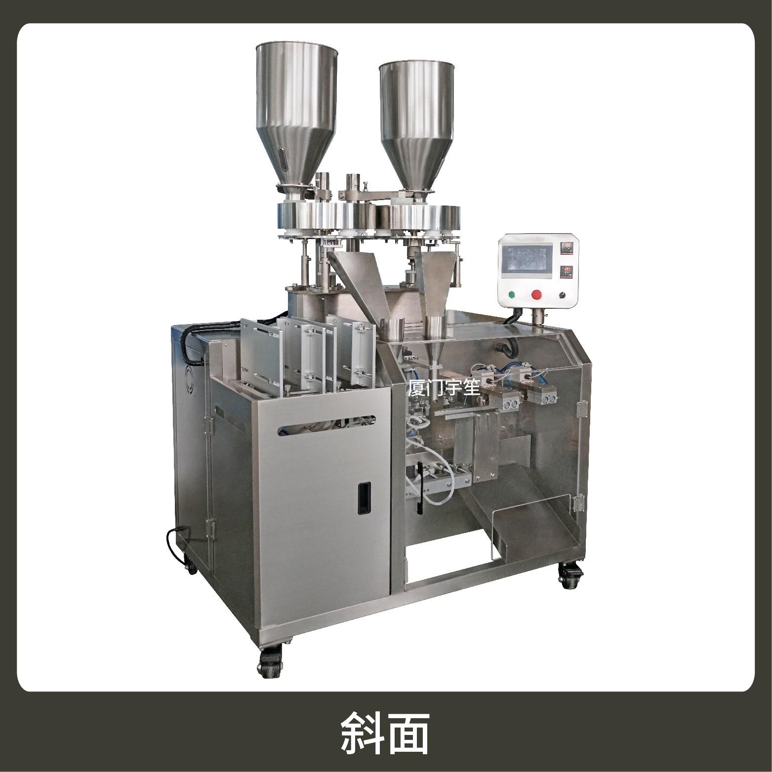 1、成品雙出,速度快,包裝流程全自動,無需人工操作??筛鶕?jù)充填物料的性質選配不同的下料結構。