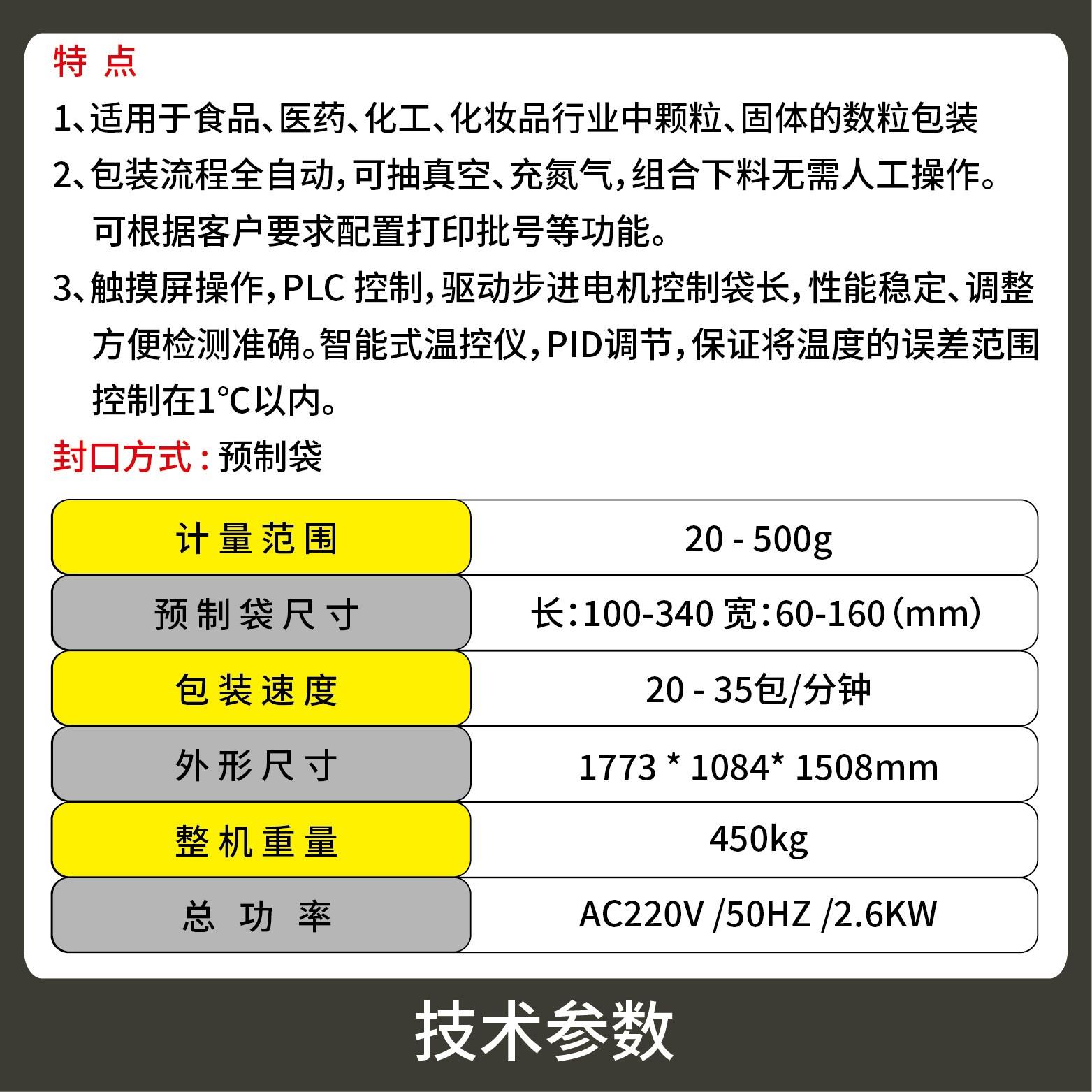 2、包裝流程全自動,無需人工操作,可抽真空、充氮?dú)?,組合下料??筛鶕?jù)充填物料的性質(zhì)選配不同的下料結(jié)構(gòu),且可根據(jù)客戶要求配置打印批號等功能。