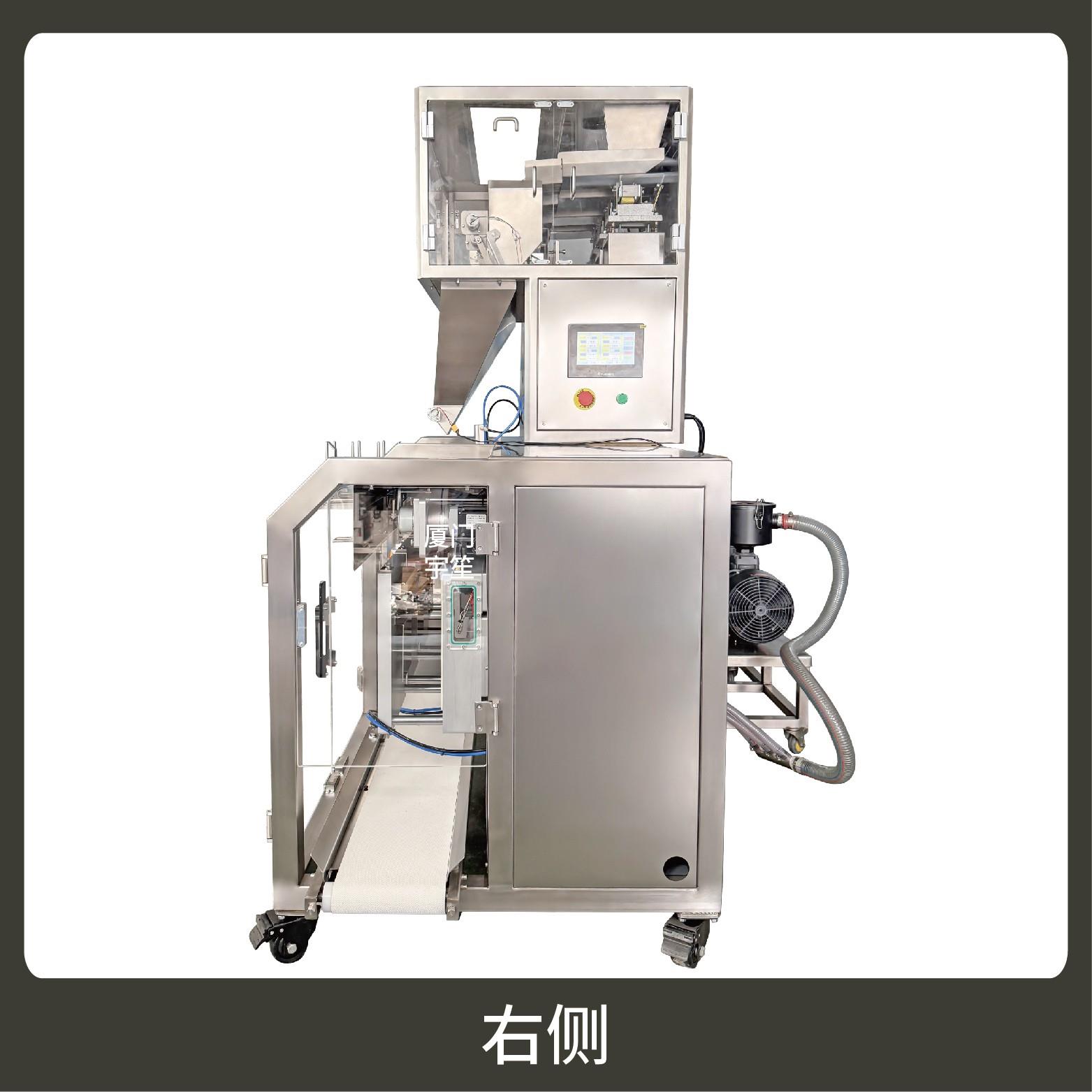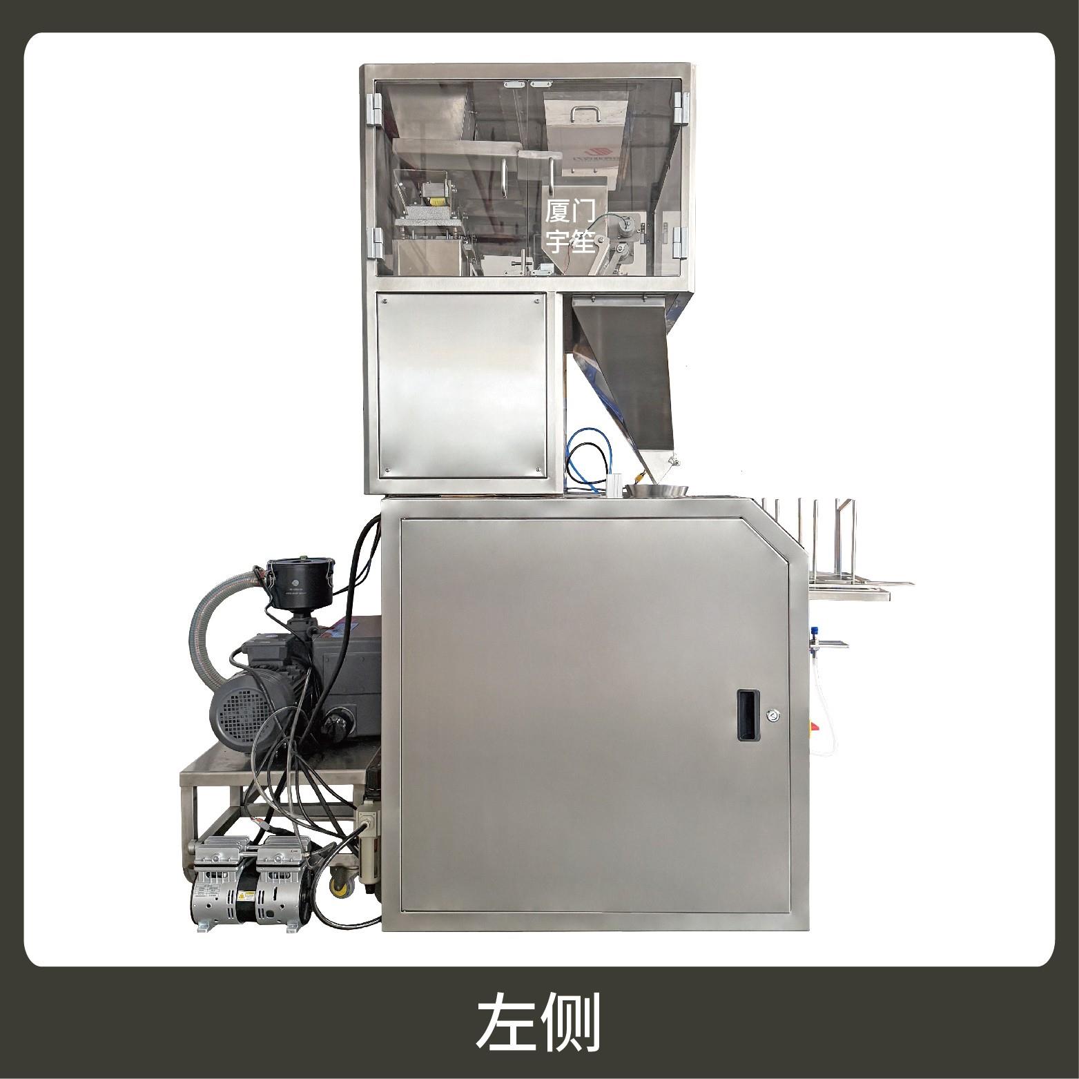 包裝流程全自動,可抽真空(真空度可達到-0.1Mpa)。可根據充填物料的性質選配不同的下料結構。